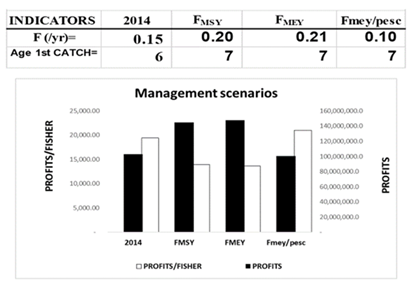 As indicators of management of this fishery, Figure 6 is shown, which displays the options to manage this fishery; based on the minimum age of the first catch and the intensity of the fishing effort.
