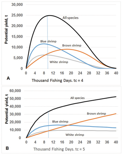 The response of the shrimp populations that make up the fishery has a differential pattern, which depends on the dynamics of each one and is a function of their adaptation to the environment and the fishing gear. In this way, each one has a potential response to fishing pressure, as seen in Figure 7a, which shows the potential production capacity of the resource depending on the intensity of fishing, expressed here as days of fishing, at an age of first capture of four months. It is perceived that the dynamics of the blue and white shrimp populations make the blue shrimp more productive, but less so the white shrimp, and the fishing intensity slightly exceeds the optimal capture level in both cases. The brown shrimp is the most productive of the three, but its catch trend indicates that it is slightly underexploited. The line that describes the global catch indicates that the total fishing mortality is very close to the optimal level, with a production of around 25 thousand tons per season.