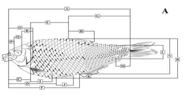 Figure 1A Morphometric data of Hemibrycon species from Amazon Basin sites given tables 3-4. A. Standard length; B. Body depth; C. Snout – pectoral-fin distance; D. Snout – pelvic-fin distance; E. Dorsal - pectoral fin distance; F. Snout – anal fin distance; G. Dorsal fin - hypural distance; H. Dorsal-fin length; I. Pectoral-fin length; J. Pelvic-fin length; K. Anal-fin length; L. Caudal-peduncle depth; M. Caudal-peduncle length; N. Dorsal-anal fin distance; O. Head length; P. Snout length; Q. Orbital diameter; R. Postorbital length; S. Maxilla length.