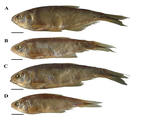 Mouth terminal, Body compressed, its greatest depth is anterior to dorsal-fin origin; dorsal and ventral margins of caudal peduncle not straight. Ventral profile convex between gill isthmus and pelvic insertion, then straight to anal-fin origin. The pectoral fin in adults is not as long as the pelvic fin; tips of pelvic fins reach the anal-fin origin in immature, but not in adults. Lateral line scales 40-44, scales between lateral line and dorsal fin origin 8-9, scales between lateral line and anal fin origin 5-7, scales between lateral line and pelvic-fin insertions 5-6. Dorsal fin rays ii, 6-7, I; first simple ray about half the length of the second simple ray. The distal margin of the dorsal fin is slightly convex. Origin of adipose fin anterior to insertion of last anal-fin ray. Anal-fin rays iii-iv, 24-28. Caudal-fin with 10-9 main rays; dorsal lobe with 5 procurrent rays and ventral lobe with 4. Total vertebrae 40, including 4 fused in Weberian apparatus; 17 precaudal vertebrae, last pleural rib not centrally fused, and last two precaudal vertebrae modified as transitional mode, no true pleural ribs; 23 caudal vertebrae, including the urostyle. Caudal skeleton with seven hypurals.
