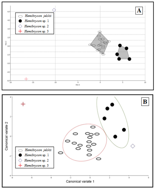 The other ten specimens have a variety of as yet undescribed forms that are different from what we recognize here as true H. jelskii. Lot NMW 57546 (3 specimens), are Cyphocharax sp. (Curimatidae). The other seven lots, although belonging to Hemibrycon, show morphological variability that is here proposed as three different species of Hemibrycon, that we have differentiated as follows: Hemibrycon sp.1 (NMW 57550.1, NMW 57551.1, NMW 57551.2, NMW 57551.4, NMW 57553.1, Figure 2B), Hemibrycon sp. 2 (NMW 57547.1, Figure 2C) Hemibrycon sp. 3 (NMW 57551.2, Figure 2D), none of which can be identified as true H. jelskii. An analysis of divergence between the type specimens explained 92.6 % of the disparity from a discriminant analysis of traditional morphometric data (Figure 3A) and 80.5 % from an analysis of canonical variables of geometric morphometric data (Figure 3B). The latter allowed establishing deformation axes generated among true Hemibrycon jelskii and the other three forms differentiated above (Figure 4), which describe the effect of an increase in body depth found for H. jelskii females (Landmarks 13 -15 and 19-20), the posterior dorsal prolongation of the skull from the supraoccipital spine (milestone 31), associated with the development of the prominent spine present in H. jelskii females and Hemibrycon sp. 1 and Hemibrycon sp. 3; development of the posterior dorsal part of the second infraorbital (landmarks 8 and 9) in Hemibrycon sp. 2; and the projection of the anterior edge of the third infraorbital (Landmarks 10, 11 and 12) with respect to the anterior end of the quadrate (Landmarks 18) (Figure 4; Table 4 and 5). The specimens identified here as true Hemibrycon jelskii are different from the populations previously recognized as Hemibrycon jelskii by Bertaco and Malabarba,6 from the Ucayali, Madre de Dios, Urubamba, and Mamoré River basins, which have different, undescribed body shapes. Based on the discriminant analysis of traditional measurements (Figure 5), the first two components explained 82.74% of their disparity; while the analysis of canonical variables from morphogeometric data made it possible to establish the deformation axes between these populations and H. jelskii, indicating that the greatest disparity is associated with characters of the skull and maxilla (Figure 6).