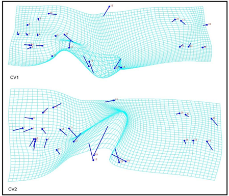 Figure 6 Deformation axes described by the analysis of canonical variables, axes of VC1 and VC2 present among the H. jelskii syntypes with respect to the Amazon populations.