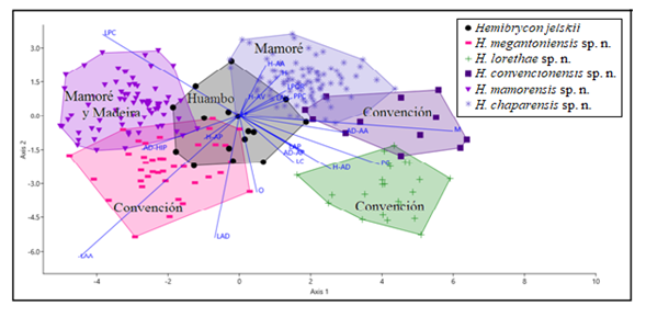 Figure 5 Discriminant analysis of type series of H. jelskii from the Huambo River, Pacific versant, compared with Amazonian populations from the Mamoré, Ucayali and Madeira River drainages previously identified as H. jelskii (Bertaco et al., 2010). The first two eigenvalues explain 83% of total variation.