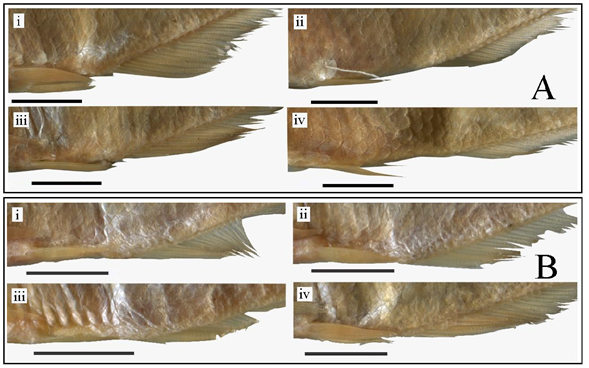 B. Hemibrycon sp.1, i. NMW 57551.1 male, ii. NMW 57551.3, female; iii. NMW 57551.4, male; IV. NMW 57553.1, female. For all scale bar =1 cm.