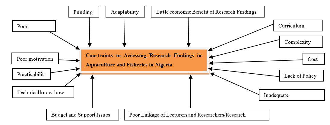 The findings of the qualitative study on research question 1 reveal 13 thematic constraints to accessing research findings in aquaculture and fisheries by agricultural education lecturers. Among other notable comments by respondents, funding issues are the major constraint to accessing research findings in aquaculture and fisheries; inadequate technical know-how; national budgetary and support issues; a lack of policy; inadequate infrastructures for accessing research findings; and the practicability of research findings, among others. Other constraints found through a quantitative study are poor promotion and information, lack of ICT competence of some lecturers, lack of ICT gadgets to access online published research findings, poor linkage of research institutes to lecturers, time constraint, lack of motivation, poor attitude of some lecturers towards accessing research findings, inability to interpret some research findings, lack of subscription of universities to published research findings, poor explanation of published technical jargon for easy understanding, and lack of open access to published research findings in aquaculture and fishery, etc. Similarly, Kleih et al.,21 found that inconsistent information and poor access to credit are major constraints for SMEs in the aquaculture and fisheries sector. Production constraints for fed species may be categorised as either market-related (dropping market prices) or environmental (eutrophication of receiving water bodies, increasing disease incidence, and concerns about food and feed safety).22
