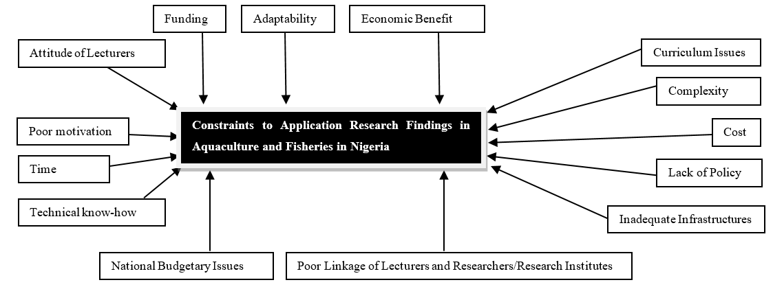 In addition, 14 thematic constraints to applying research findings in aquaculture and fisheries were found in a qualitative study on research question 1. These, among others, include major funding problems, adaptability and complexity of some research findings, policy issues, time, cost, budgetary issues, incompatibility with curriculum content and objectives, and inadequate infrastructure and technical know-how for applying research findings. In corroboration, other constraints revealed by the quantitative study on research question 2 include lack of competence to demonstrate research findings, inadequate technical information to apply the research findings, inadequate infrastructures in the universities, cultural discrimination, non-availability of technical experts for guidance, high cost and complexity of application, time, inadaptability of some research findings, lack of motivation, and curriculum overload, among others. Mungkung et al.23 found that there is minimal Open Educational Recourse content available for higher education in the aquaculture and fishing industry due to a lack of knowledge, institutional support, and technical hurdles. Other studies support this finding are Baildon and Ong, Zhao & Hou.24,25