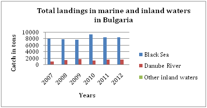 The total landings of Bulgaria for 2012 were 9,595.2 tons. This is 0.4% less than the catch in 2011 because of the Danube River and inland fish catch decreased since the Black Sea landings slightly increased (Figure 4). The catch in the Black Sea for 2011 was as follows: 8,147.6 t (84.6%) – Black Sea; 1,350.6 (14%) - inland waters and 136.3 tons (1.4%) in Danube River (Table 8).