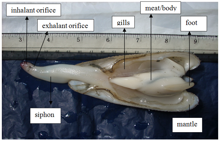 Figure 2 Pholas orientalis opened up to show the different parts used, extracted and assayed for antimicrobial activities.