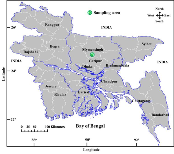 The research was conducted in a fish pond of Mymensingh (24⁰45’14″N and 90⁰24’11″E) district, Bangladesh (Figure 1). The fish pond was selected considering the climatic condition and surrounding environment. The average annual temperature in the sampling site is 26.41⁰C. The area of the pond was 3440 m2 and the average depth was 6 ft (Figure 2). There were no inlet or outlet facilities in the pond. The pond received domestic wastes, silt particles, plastic materials, and decomposed organic nutrients through sullage connections from the adjacent houses. Besides, surface run-off and slums wash were also entered into the pond. Due to nutrient-rich water and high population densities in conjunction with rudimentary sanitation facilities, the pond could be considered eutrophic. Anthropogenic stressed conditions were prevalent during the study period.