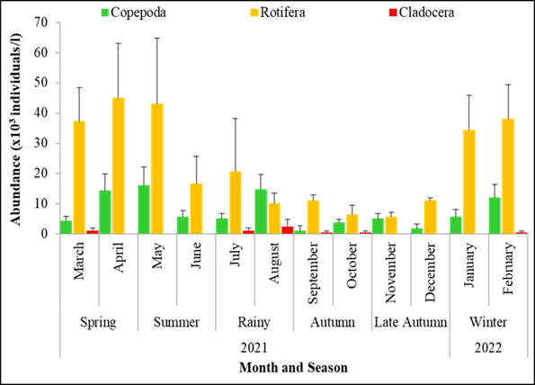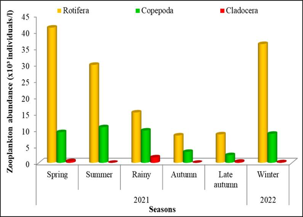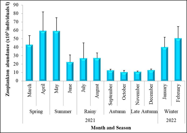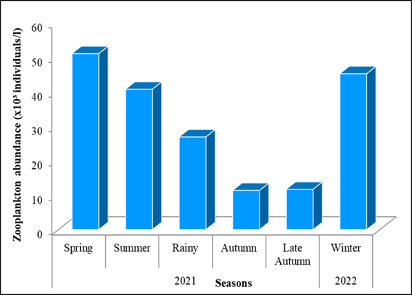Zooplankton was observed throughout the year, and evidence of seasonal fluctuation was visible. Zooplankton abundance was found to be highest in the spring season (Figure 5). After spring, a decreasing trend in zooplankton abundance was found, and the lowest abundance was noted in autumn. Again, peak zooplankton abundance was found in the winter season.