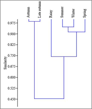 In order to reveal the similarities among seasons, cluster analysis (CA) was performed based on the total abundance of the zooplankton community. Cluster analysis was carried out using the Bray–Curtis similarity. At a similarity of 75%, three significant clusters were found among seasons (Figure 7). The large cluster contained three seasons (summer, winter, and spring), one cluster contained two seasons (autumn, late autumn), while another cluster (rainy) remained isolated.
