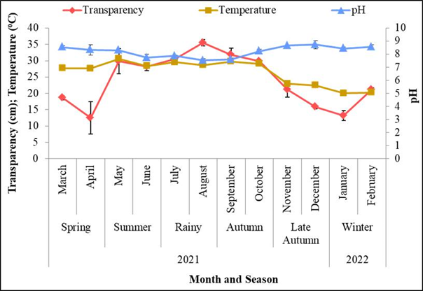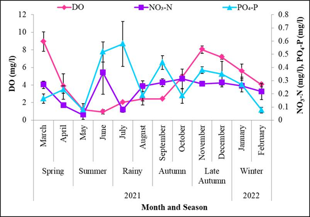 The values of environmental factors were found to vary in different months (Figures 8 & 9). The water transparency ranged from 12.5±5 cm to 35.5±1 cm. The transparency was highest recorded in August, and the lowest was in April. The water temperature ranged from 20.06±0.11 ⁰C to 30.56±0.23 ⁰C. The water temperature reached its highest value in May, whereas the lowest was recorded in January. Alkaline pH values were recorded during the study period from March 2021 to February 2022. The values of water pH were recorded as maximum (8.73) and minimum (7.53) in December and August, respectively. The DO concentration varied from 0.93±0.25 mg/l to 8.93±1.10 mg/l. DO was noted to be highest in March and lowest in June. The NO3-N concentration varied from 0.039±0.03 mg/l to 0.36±0.16 mg/l. The highest NO3-N value was observed in June, and the lowest was in May. The PO4-P concentrations varied from 0.077±0.02 mg/l to 0.57±0.16 mg/l. The lowest concentration of PO4-P was detected in February, while the highest values were observed in July.