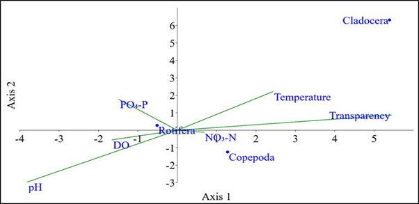 The canonical correspondence analysis (CCA) demonstrated a clear relationship between the zooplankton groups and environmental parameters. The CCA identified that pH, transparency, and temperature significantly impact the abundance of zooplankton groups in different seasons. The lower abundance of Cladocera was highly correlated with the environmental parameters. Several previous studies have also shown that zooplankton communities are controlled by different environmental variables.3,56,57
