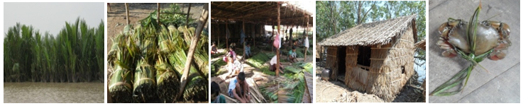 Local people sell the Nypa thatches that a bundle of leaflets is locally known as a “pal”. A pal of leaflet bundle included the leaflets from 50 leaves. 50 thatches can get from one pal. 100 thatches can sell about 3500kyats. For a women, about 400 thatches can made by hand per day, their income are 100 thatches for 400 or 500kyats. The Nypa that ches were also used as roof material for houses, boats and dwelling and for wall-partitioning. The products are not only used in the local but also sell to other regions. Leaflets of Nypa were also used to tie the crabs as a rope, not to move the crabs in crab fishery purposes.