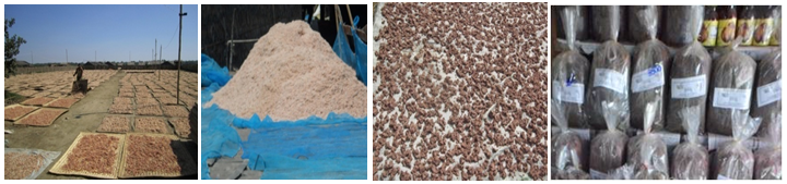 One viss of shrimp species were boiled with water and put into one teaspoon of salt at15 minutes. These boiled shrimps were taken on sun-dried for two days or put into the shelf and spread them and giving the fire under the shelf or smoked. The smoked or boiled shrimp were taken and put inside the sac and pounded with heavy stick to remove their heads, tails and scales. One viss of fresh shrimps were smoked to obtained10-15ticals of dried shrimp. Total production of 8,000-8,500viss of dried shrimp from Htaung-gyi-tan village over the dry period 2014-2015 has been obtained and 80,000-85,000viss from Ahshey-hpyar village, 160,000-165,000viss from Nauk-mee village were occured. These dried shrimp were transported to Pyapon Township and Rangoon Region. The price of this dried shrimp was about 15,000-28,000kyats.
