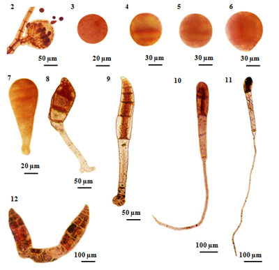 Figure 2 Carpospores and their early development of Polysiphonia subtilissima Montagne. (2) Liberated carpospores from mature cystocarp. (3) Released carpospores. (4)Three unequal- celled stages formed within 12-24 hours. (5) The second segmentation of carpospores germling showing unequal four cells with 24-36 hours. (6) Beginning of germination three days after initiating. (7) Four-celled stage 3-5 days after initiating. (8) The rhizoidal portion of sporeling curved slightly (arrow) after 6-7 days. (9) The germling resulted in 6-8 cells stage and an expanded disc-like rhizoid; the main axis becoming slightly curved after 7 days. (10) After 7-10 days germlings, the number of 8-10 cells, lateral pericentral cells. (11) After 12 days germlings, the number of several cells and rhizoidal cells. (12) After 15 days old carposporelings.