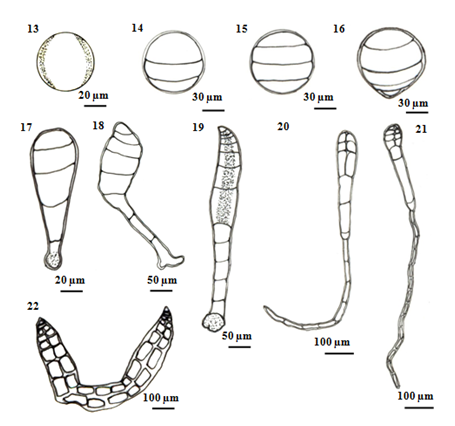 Figure 3 Schematic drawing showing successive stages of carpospores germination in P. subtilissima Montagne. (13) Released carpospores. (14) Three unequal-celled stage formed within 12 - 24 hours. (15) The second segmentation of carpospores germling showing unequal four cells with 24 - 36 hours. (16) Beginning of germination three days after initiating. (17) Four-celled stage 3-5 days after initiating. (18) The rhizoidal portion of sporeling curved slightly after 6-7 days. (19) The germling resulted in 6 - 8 cells stage and an expanded disc-like rhizoid. the main axis becoming slightly curved after 7 days. (20) After 7-10 days germlings, the number of 8-10 cells, lateral pericentral cells. (21) After 12 days germlings, the number of several cells and rhizoidal cells. (22) After 15 days old carposporelings.