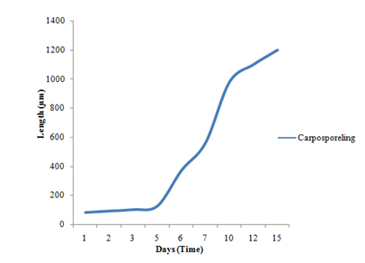 Figure 4 Average means length of carpospores germling of P. subtilissima Montagne during 15 days culture periods.