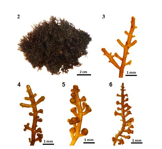 Figures 2-6 Field-collected plant of Laurencia sp.1. (2) Habit of a plant. (3) Part of a sterile plant. (4) Part of a tetrasporangial plant. (5) Part of a spermatangial plant. (6) Part of a carpogonial plant.