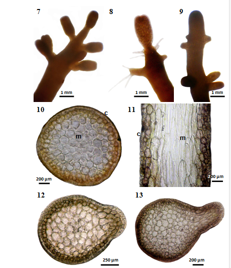 Figures 7-13 Laurencia sp.1 cultured at 25°C under 16:8 LD. (7-9) Apical portion of main axis with lateral branchlets(MMB 11136). (10) Cross section of main branch with medulla (m) and cortex (c) cells (MMB 11137). (11) Longitudinal section of main branch with medulla (m) and cortex (c) cells (MMB 11138). (12-13) Cross section of main axis with initial lateral branch (MMB 11139).