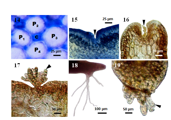 Figures 14-19 Laurencia sp.1 cultured at 25°C under 16:8 LD. (14) Cross section of main branch showing central (c) and four pericentral (p) cells (MMB 11140). (15) Longitudinal section of main branch showing apical depression (arrowhead) (MMB 11141). (16) Longitudinal section of main branch showing apical depression with initial trichoblast (arrowhead) (MMB 11142). (17) A young trichoblast (arrowhead) (MMB 11143). (18) Unicellular rhizoids (MMB 11144). (19) Longitudinal section of main branch showing unicellular rhizoids (arrowhead) arising from the pericentral cells (MMB 11145).