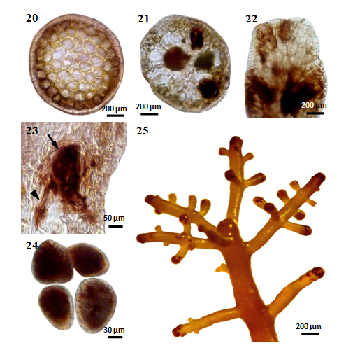 The trichoblast (Figures 16-17) grow from a young pericentral cell, which is located near the apical cell. The first branches produce laterals alternately. The monosiphonoustrichoblasts taper from the base to apex and consist of (4-10) branches, each terminating obtusely with a conical cell. The mature trichoblasts are subdichotomously branched. The formation of corps en cerise was not found in cortical and sterile trichoblast cells.