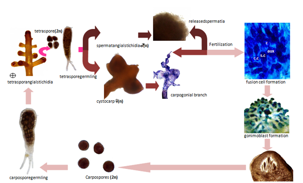 Figure 40 represents the diagram of reproductive features in life history of Laurencia sp.1, according to the stages of the development of reproductive structures, viz., tetrasporangia, procarp, cystocarp and spermatangia and the spore germination. The germination pattern of tetraspore was similar in carpospore. The germlings of tetraspore and carpospore showed the Fucus type germination pattern. According to the stages of the development, the spermatangialstichidia released male gametes or spermatia. And then, male gametes or spermatia fused with the female gametes or carpogonia. Carpospores were released after mixing with male gametes or spermatia and female gametes or carpogonia. Carpospores germinated into tetrasporophytic plants. Tetraspores released and then germinated that formed male and female gametophytic plants.