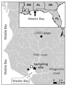 Figure 1 Map of the Weeks Bay watershed, Alabama, USA, showing the sampling site () (30 24.97’N, 87 49.37’W), locations of NOAA’s meteorological station (□) maintained by Weeks Bay National Estuarine Research Reserve, the USGS groundwater well (▲), and USGS discharge gage on Fish River (●).