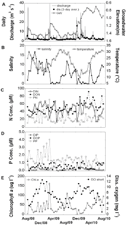 Figure 2 Variation in physical and chemical characteristics at the study site. A) Daily discharge from the Fish River: daily values as well as 3-day average prior sampling, depth to groundwater table at USGS well (the depth to groundwater table is inversely correlated with the volume of GW at the well). C) Variation in dissolved inorganic and organic nitrogen (DIN and DON) and particulate nitrogen (PN). D) Variation in dissolved inorganic and organic phosphorus (DIP and DOP) and particulate phosphorus (PP). E) Variation in chlorophyll a concentration and dissolved oxygen concentration.