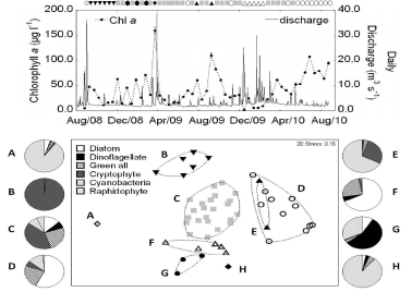 Figure 4 Upper panel: Variation in chlorophyll a concentration and discharge. Symbols above the upper panel correspond to the clusters defined by multi-dimensional scaling (MDS) analysis based on the phytoplankton composition (lower panel). The symbols above the upper panel therefore represent phytoplankton composition at the specific time, chlorophyll a concentration and discharge. Lower panel: Multi-dimensional scaling plot of class-level community composition data. Symbols correspond to clusters (A-H) defined at 50% similarity (see text for details). Note that Cluster E is distinct from Cluster D: the coincidence is an artifact of ordination in only 2 dimensions. The pie charts show the average phytoplankton abundance for samples from each cluster. For clarity all chlorophycean lineages (chlorophytes, prasinophytes and euglenophytes) have been grouped as “Green all” and classes with minor contributions (chrysophytes, dictyophytes, and prymnesiophytes) have been omitted from the pie charts.