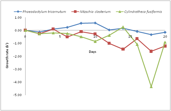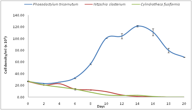 Figure 3 Growth observed in cell density (cells.ml -1) for different species of Bacillariophyte algae.