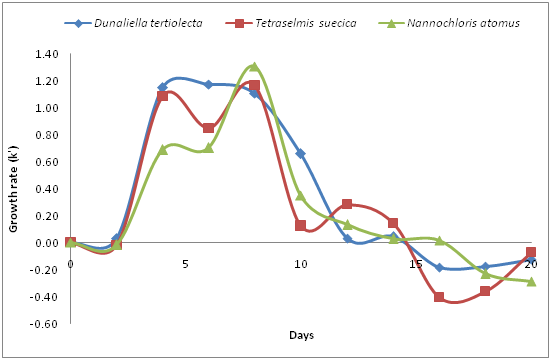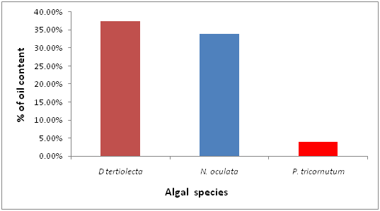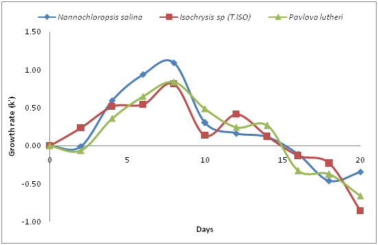 During the corresponding period, the cell densities of N. closterium and C. fusiformis decreased sharply and the growth rate became negative. Towards the end of the experimental period, the cell density decreased to 0.023 x 104 and 0.005 x 104 cells ml-1 for N. closterium and C. fusiformis, respectively. The growth rates of the Chlorophyte algae cultures are depicted in Figure 4. At the beginning, the growth rate of all three species increased. The highest growth rate was demonstrated by D.tertiolecta (1.169), followed by T. suecica (1.161). After day 15, the growth rate of this group started decreasing and a negative growth rate was recorded on day 16, which continued right up until day 20. On the other hand, the low growth rate of all algal species of Chrysophyte algae continued to day 14, but decreased considerably thereafter (Figure 5). The highest growth rate was shown by N. atomus, (1.091) followed by P. lutheri (0.840) and Isochrysis sp (0.811). All the species of diatoms (Bacillariophytes) showed poor growth rates (Figure 6), exhibiting negative growth rates from the beginning, except the species P. tricornutum, which showed a positive growth rate (the highest was 0.569 ) and only commenced a negative growth rate on day 16, which continued right up until day 20. N. closterium and C. fusiformis did not demonstrate any positive growth during the entire culture period. The oil content in the D. tertiolecta biomass harvested during the stationary phase was about 37.4 % (w/w, dry basis). Oil content in N. oculata was found to be within the normal range (34%) and oil content in P. tricornutum was relatively very low (4% dry weight) (Figure 7).