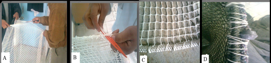 Figure 3 Attaching the net to the PVC structures of the pond cage (A) and cages (2m3) mounted on a galvanized iron structure used in reservoirs (B).