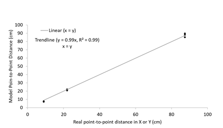 We found no significant differences between the median of the 3D model and the known underwater objects for the X–Y (n =9, R2 =0.98; p =0.214; Wilcoxon matched pairs test test) and Z planes (n =6, R2 =0.94; p =0.01; Wilcoxon matched pairs test), The root mean square errors (RMSE) of the models were 1.54 cm in X-Y and 1.04 cm in Z. There was a high degree of accuracy of the X-Y and Z dimensions, at 93 ±0.09% (mean ±SD) and 93 ±0.04% respectively.