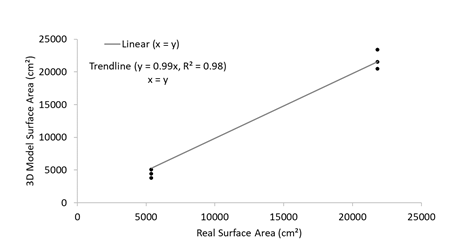 The models’ surface area lined up well with their true surface area (n =6, R2 =0.99; p =0.249; Wilcoxon matched pairs test). Regression plots of surface area suggest slight underestimation of the models’ surface area (Figure 4). The RMSE of the models was 1156 cm2 for surface area which is relatively low, hence providing a more accurate model to predict surface area from.