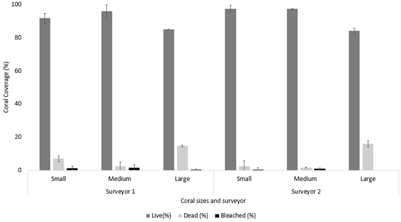 The small coral surveyed was located on a vertical reef wall, hence introducing overhangs and had fragmented growth. The large coral was nested in the reef, hence obstructing visual survey and, as a result, these conditions may have led to an overestimation of live coral cover. On the other hand, the medium and large corals were on flat ground, so the easiest to survey with the least discrepancy between surveyor and survey type. Additionally, a study by Leujak et al.,38 that compared six coral community survey methods, although, 3D modelling was not one of these, found that ex -situ video analysis was the most accurate compared to the other five in-situ survey methods. Thus reinforcing the results found on this survey that ex-situ survey techniques (3D coral modelling) are more accurate and consistent compared to in situ survey techniques.
