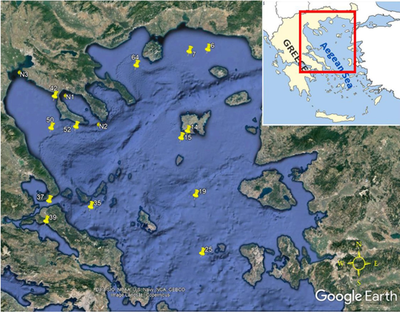 Individuals of Pteria hirundo were sporadically collected (Figure 1) during the period 2006-2021 among by catches of commercial fishing gears of: i) trammel nets and ii) trawls, in the North and Central Aegean Sea.