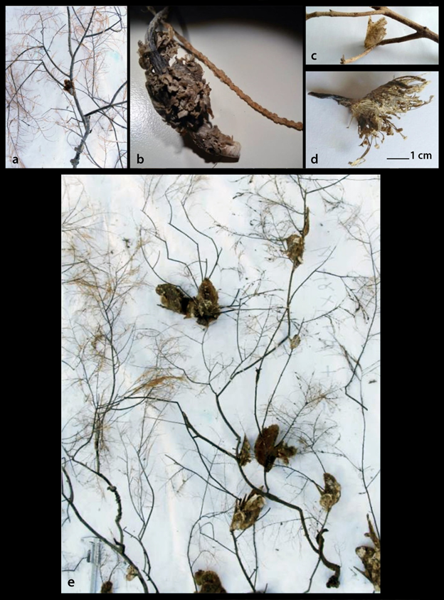 Figure 2 Pteria hirundo substrates: a. The coral Antipathes dichotoma with an attached P. hirundo individual; b. The coral Eunicella singularis holdfast (“root”) with a part of its dry branch; c. Branch of a land tree; d. Byssus; e. P. hirundo individuals attached on Antipathes dichotoma branches when removed by the trammel nets in September 2006.