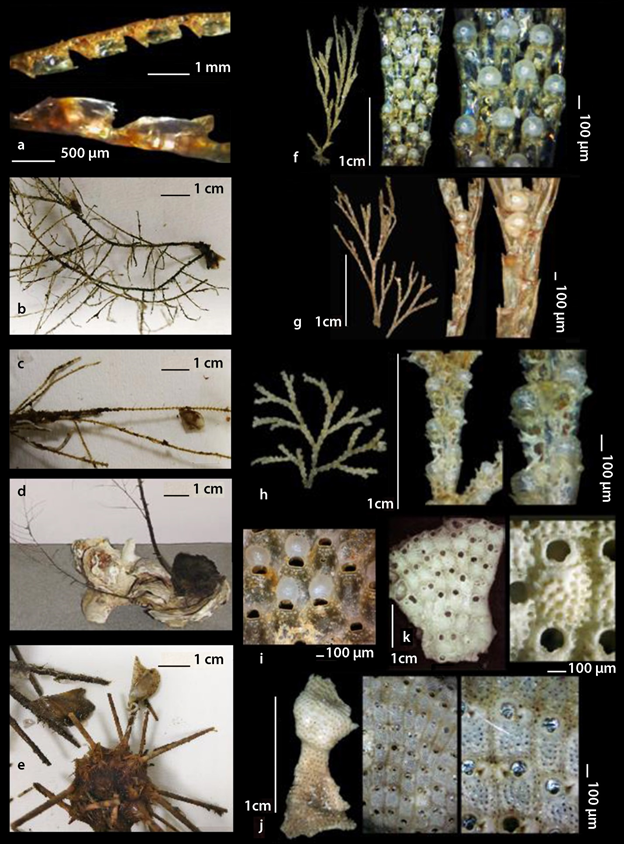 Figure 3 Substrates of Pteria hirundo. a-c. Hydrozoa: a. Aglaophenia cf. elongata Meneghini, 1845; b. Lafoea cf. dumosa (Fleming, 1820); c. Nemertesia cf. antennina (Linnaeus, 1758); Bivalvia: d. Neopycnodonte cochlear (Poli, 1795) and Antipathes sp. coral; Echinodermata: e. Cidaris aff. cidaris (Linnaeus, 1758); Bryozoa epibionts: f. Bugulina flabellata (Thompson in Gray, 1848); g. Bugula neritina (Linnaeus, 1758); h. Cradoscrupocellaria cf. bertholletii; i. Fenestrulina orientalis Liu & Liu, 2001; j. Schizoporella errata (Waters, 1878) ; k. Schizoporella cf. japonica Ortmann, 1890.