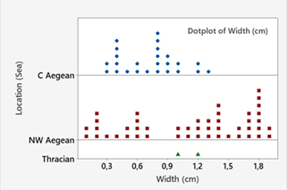 Independently of the fishing gear and the recorded period, the size of the individuals in terms of width is presented in figure 5, and shows larger individuals in the NW Aegean Sea.