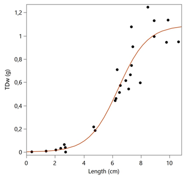 Figure 7 Logistic 3P Prediction model for the total dry weight (TDw) changes with the size (Length).