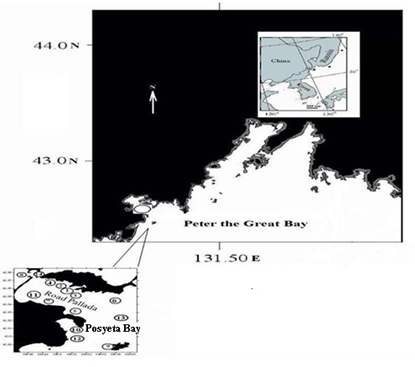 The study was undertaken in Posyeta Bay (42°30'N,130°55'E) (Figure 1) located in the northwestern part of the Sea of Japan at the junction of Russia, China and Korea. This Bay, extending 17 miles inland, is considered the cleanest bay in Peter the Great Bay due to the sparse human population and absence of large industries.7 It is cooled from the north by the Primorsky Current and warmed from the south by the East Korean Current (a branch of the warm Tsushima Current).8 Tides in the Bay are small, semidiurnal and irregular and the wind drives most water movement.9 Since the Bay is quite large, sampling was performed at 14 stations/locations listed in Table 1. These vary in sea depth and distance from the marine farm used as a base. The marine farm, station 14, is close to the well established seafood processing plant in the village of Posyet at the outlet of the Novgorodsky Bay (actually a shallow lake, average depth 8m) where water temperature reaches 30°C in summer.