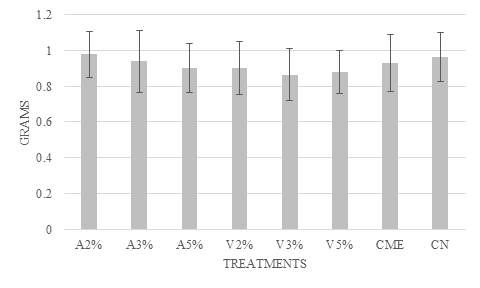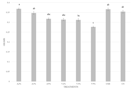 SGRdepicted significant differences among treatments. Treatment A2 had the best performance with 0.368g (p=0.000042), followed by CME with 0.365g (p=0.000051). The treatment with the lowest value was V5 with 0.277g (p=0.314123; Figure 2). Since the first measure, this treatment had this behavior throughout the whole experiment.