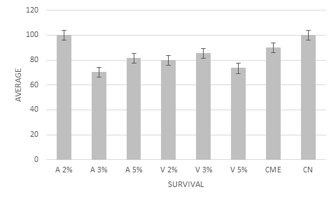 There were statistical differences among treatments in survival. Treatments A2 and CN presented 100% of survival. The lowest survival was for A3 with 70% (Figure 3).