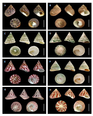 Figure 2 (A–H) Top Shell: (A) Monodonta labio (Linnaeus, 1758), (B) M. canalifera Lamarck, 1816, (C) Tectus fenestratus (Gmelin, 1791), (D) T. pyramis (Born, 1778), (E) Trochus conus Gmelin, 1791, (F) T. maculatus Linnaeus, 1758, (G) T. niloticus Linnaeus, 1767, (H) T. radiatus Gmelin, 1791. Scale bars=10 cm.