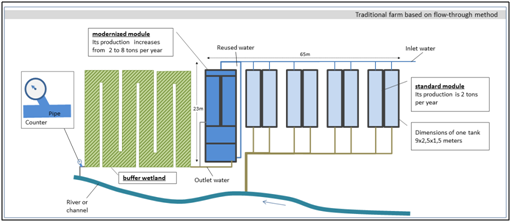 For modeling of the proposed technology we used fish-farming enterprise with the following annual profile: water consumption–548,658 m3, electricity consumption–34,146 kW and productivity–10 tons of trout per year. The production area consisted of 10 standard fish-tanks; the dimensions of each were 9 m length x 2.5 m width x 1.5 m depth. Fish rearing was implemented using traditional technology, resulting in an annual production capacity (productivity) of 2 tons for each standard module consisting of two fish-tanks (Figure 1). In the experimental model, an area of two fish-tanks was allocated and modernized by the plan, as shown in Figure 1, leading to an increase in the annual production capacity from 2 to 8 tons.