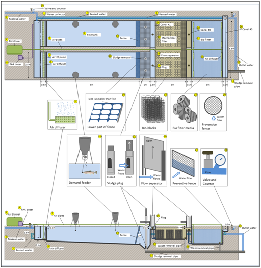 In the second compartment the airlift pump (point 5) was set. It is a 60 cm width channel which is connected to the air blower (point 8) via pipes (point 7) with a bottom extending along the entire length of the diffuser (point 6). The blower was used to inject the air to raise the water level to the top of the fence, leading to the next compartment. Along with this, the water becomes more saturated by dissolved oxygen reaching the level of 90% that is favorable for trout. The third compartment is the fish-tanks (point 9), in which the rearing for the rainbow trout fish was implemented and the fish were fed by demand feeders (point 31). Each tank has The dimensions of each of these tanks were 9 m length x 2.5 m with a depth of 1.5 m at the beginning of the tank and 2 m at the end of it, forming a ramp of about 5o, whereby there is a near-bottom current towards a settling cone (point 11). This settling cone is a part of sludge removl section where both uneaten food residue and feces were accumulated. At the bottom of this cone there is a hole with sludge plug (point 12), periodic lifting which allows the settled particles to be washed, outputting them via pipe system (point 13) to the buffer wetland see Figure 1, together with 4-5% water. Then the water falls by gravity to the next compartment. The fourth compartment is a canal # 1 (point 14), which precedes a mechanical filtration compartment (point 17). This canal is provided with a flow separator (point 15), and pipe plugs on the output (point 16) that is intended to distinguish the water streams during the tank cleaning. In normal operation mode the flow separator is closed.