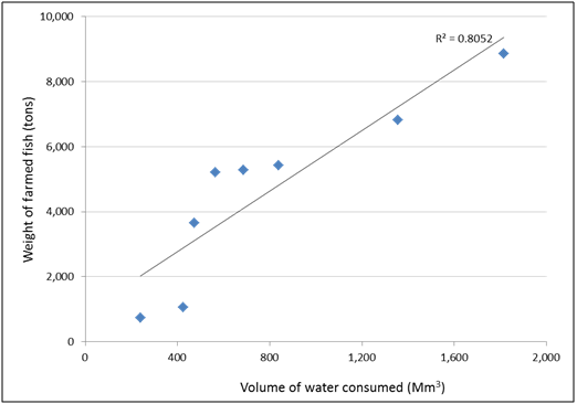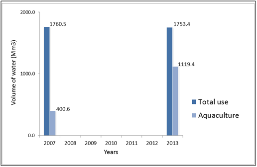 Figure 3 revealed that the Armenian fish production from the aquaculture sector increases with the increase in water consumption. Unfortunately, there was no official statistical data available for the annual artesian water consumption (either for total or aquaculture aspect). However, according to the available literature, the total annual artesian water consumption was found to be ranging between 2,021 Mm3/year in 198515 and 1,624Mm3/year16 in 1983. The USAID report,17 monitoring the intake artesian water for both 2007 and 2013, indicated that the total annual artesian water consumption were more or less that same (Figure 4) while the share of artesian water used in the aquaculture sector was increased to from400.6 Mm3/year in 2007 to 1119.4 Mm3/year in 2013 (Figure 4).