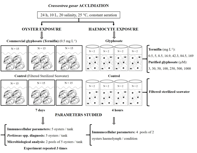 The objective of this study was to evaluate the effect of glyphosate herbicide on different aspects of C. gasar oyster biology, including immune defence responses, gastrointestinal tract microbiota and Perkinsus spp. infection.