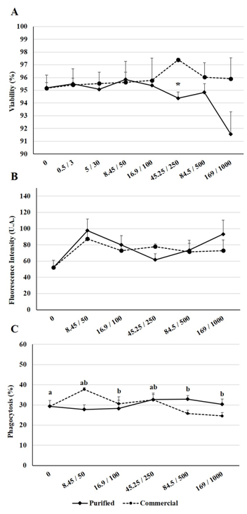 Figure 2 Effects of glyphosate (commercial and purified) on Crassostrea gasar haemocytes after 4 h of direct contact. (A) Haemocyte viability. *Significant difference between glyphosate formulations (One-way ANOVA, P< 0.05). (B) Production of reactive oxygen species. (C) Phagocytosis rate. Different letters indicate significant differences among concentrations (Two-way ANOVA, P<0.05). Concentrations of the compounds are given in w/v and its equivalent molarity (mgL-1/µM). Data are reported as mean±SE. N: 4 pools of 2 oysters per concentration and treatment.